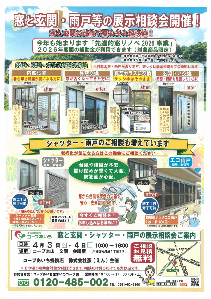 コープあいち提携工務店による「内窓」「採風雨戸」「断熱サッシ」「シャッター」などの見本展示相談会です。