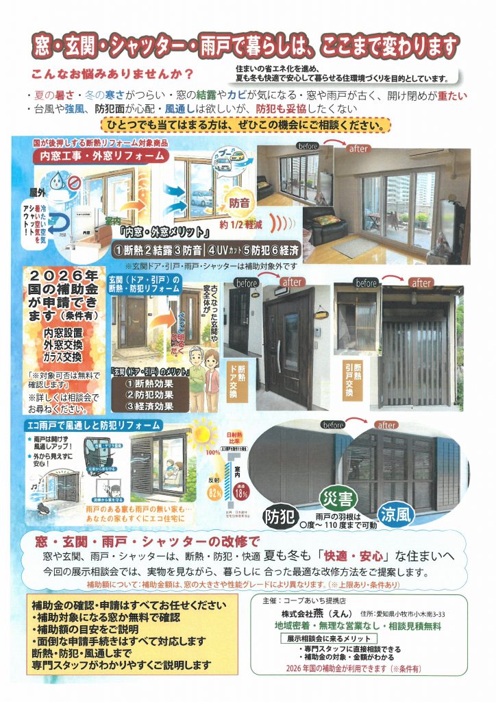 コープあいち提携工務店による「内窓」「採風雨戸」「断熱サッシ」「シャッター」などの見本展示相談会です。