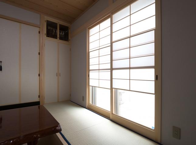 玄関の天井板は旧家の再利用、LDKにも化粧梁を設置して「和」を演出し、雪見障子超しに見える小庭はお気に入りです。